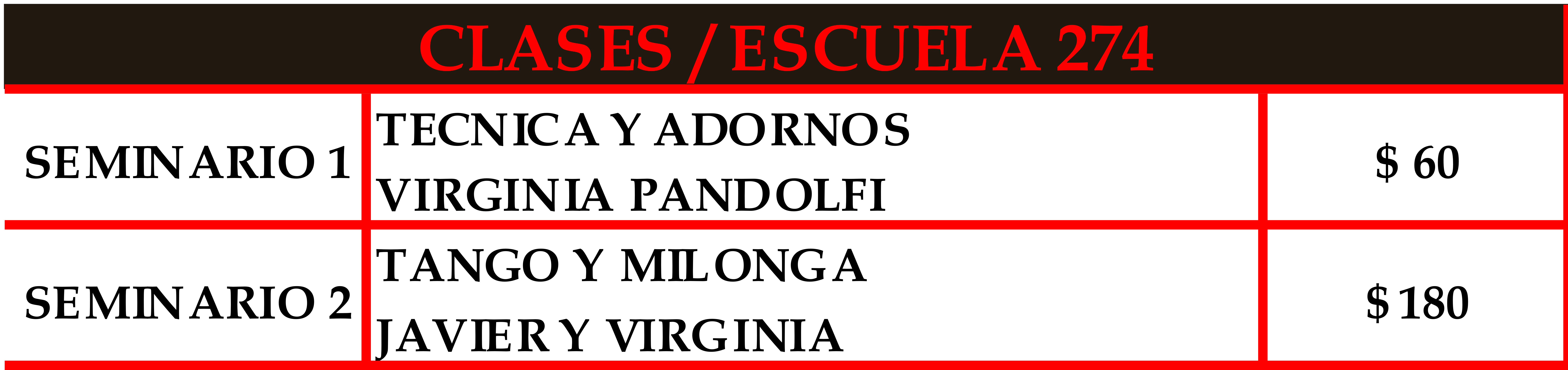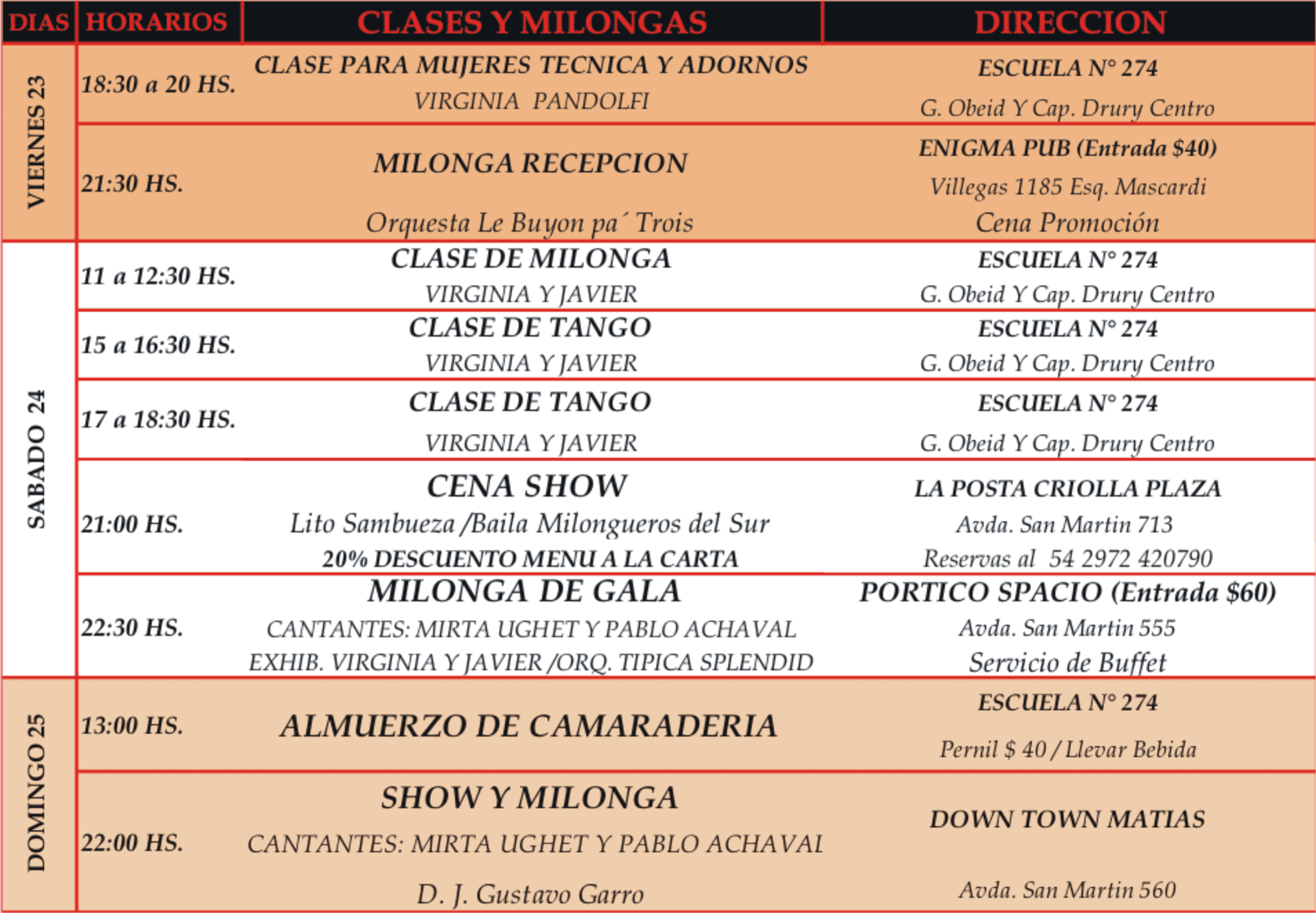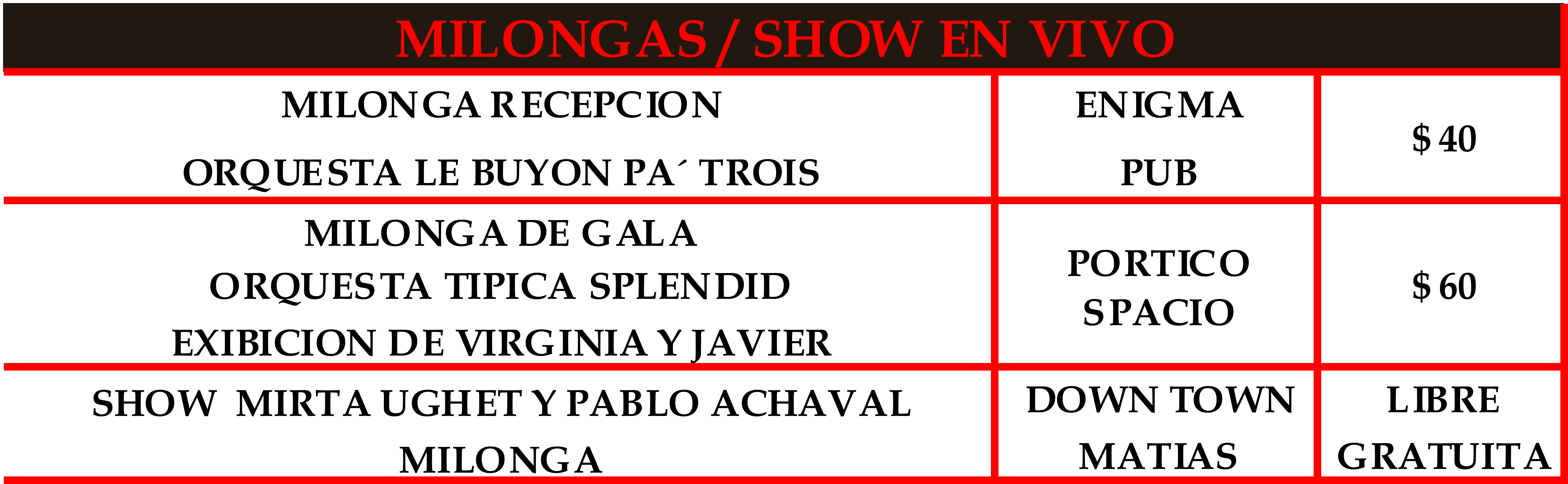 + Milongas (viernes y sabado) $ 220.